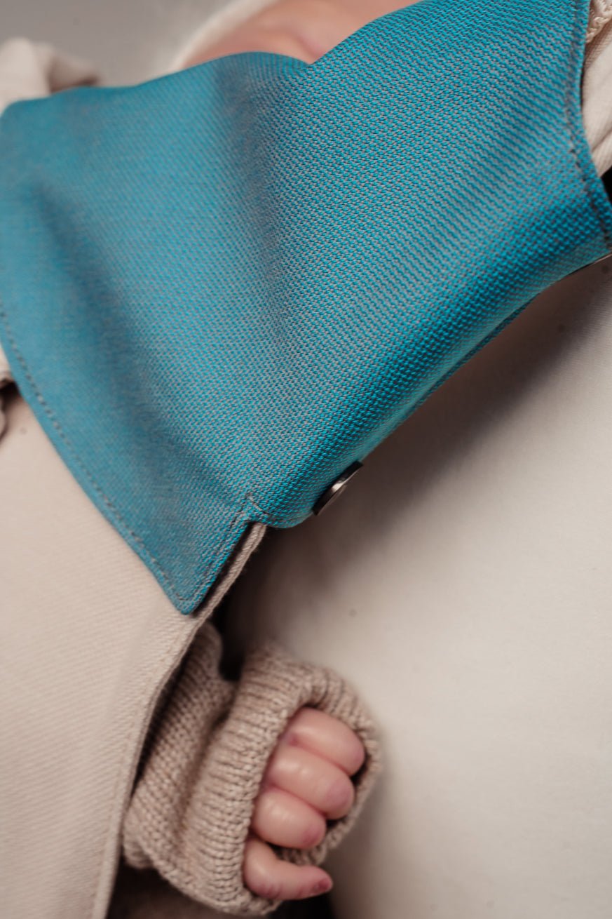 Vous pouvez utiliser les protège-bretelles dans le magnifique bleu pétrole de notre design Just Lagoon comme accessoire idéal et pour protéger les bretelles de votre porte-bébé.