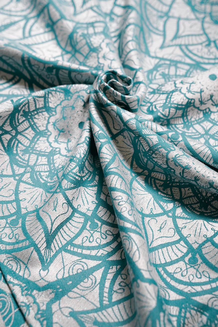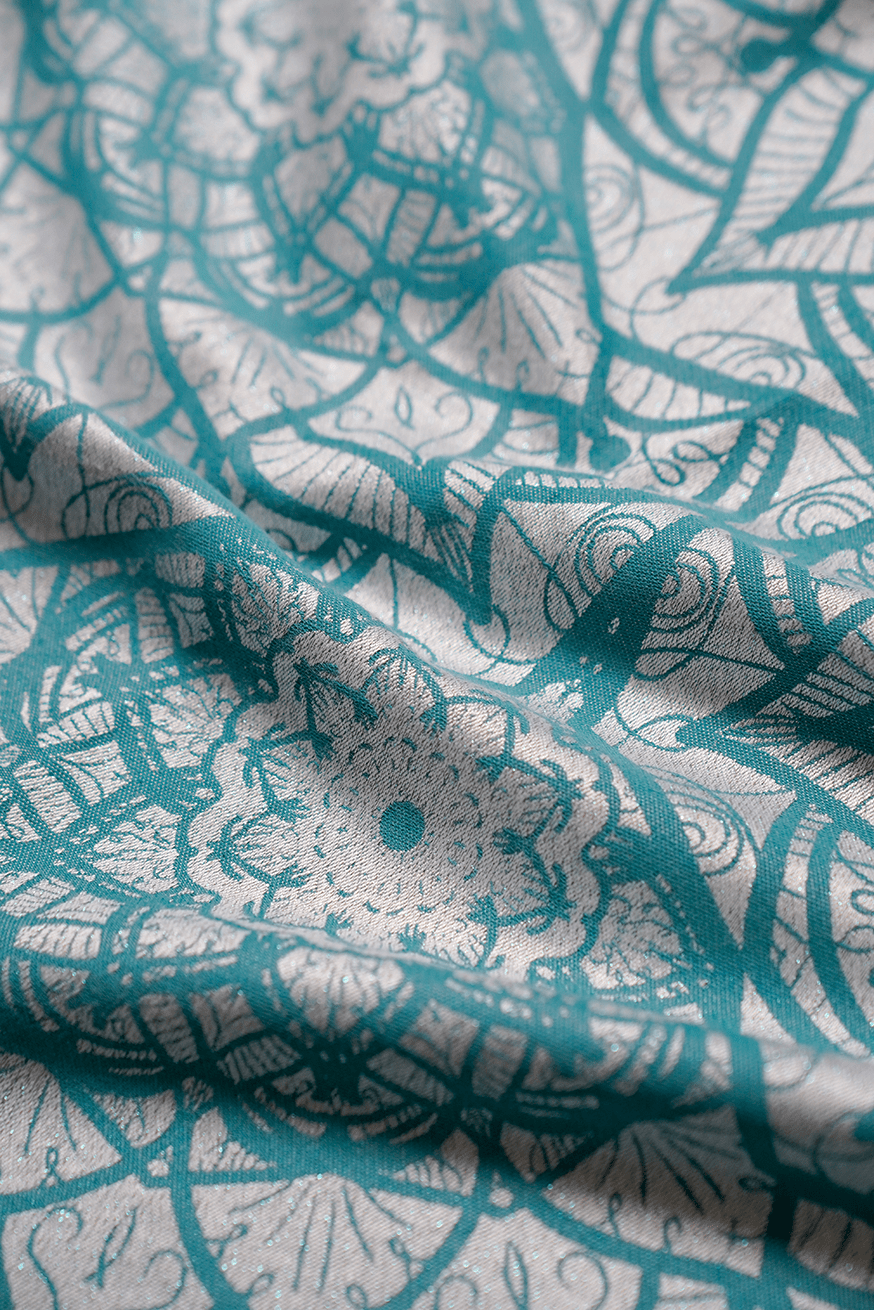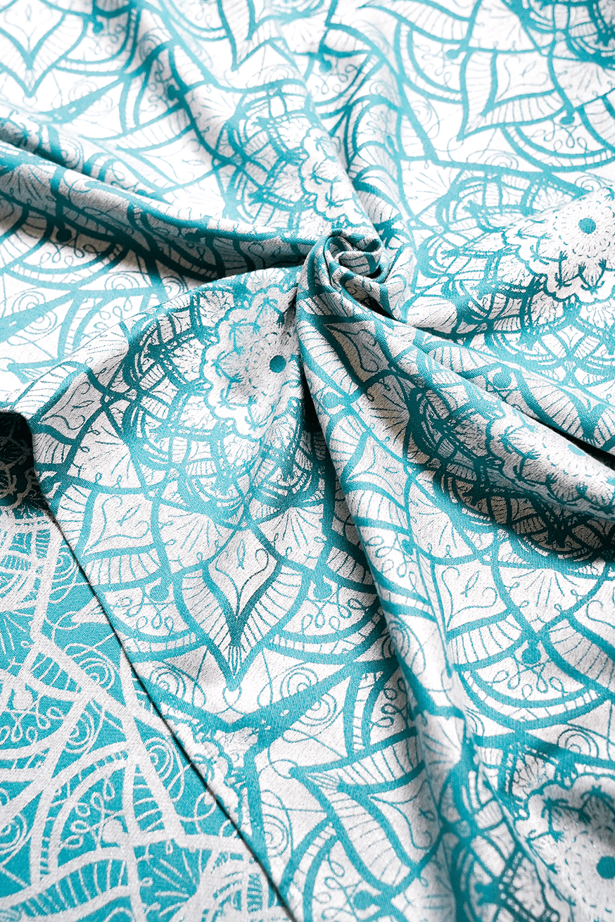 Die zarten Mandala-Blüten leuchten in hellem Türkis, das Tuch glänzt dezent im Licht – ein textiles Gedicht voller Harmonie.